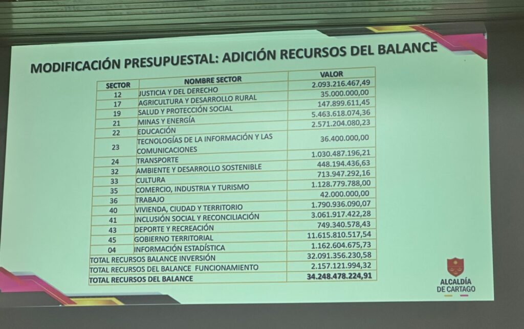 Tras la presentación del proyecto de acuerdo por parte del ejecutivo ante el Concejo Municipal de Cartago, esta corporación aprobó los traslados y adiciones presupuestales con el objetivo de dar cumplimiento a lo que dice la ley y los plasmado en el plan de desarrollo Más Progreso, Mejor futuro.