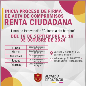 Se informa a todos los beneficiarios del programa Renta Ciudadana que se ha iniciado el proceso para la firma de actas de compromiso. Este paso es esencial para garantizar el acceso continuo a los beneficios del programa y para asegurar el cumplimiento de los requisitos establecidos.